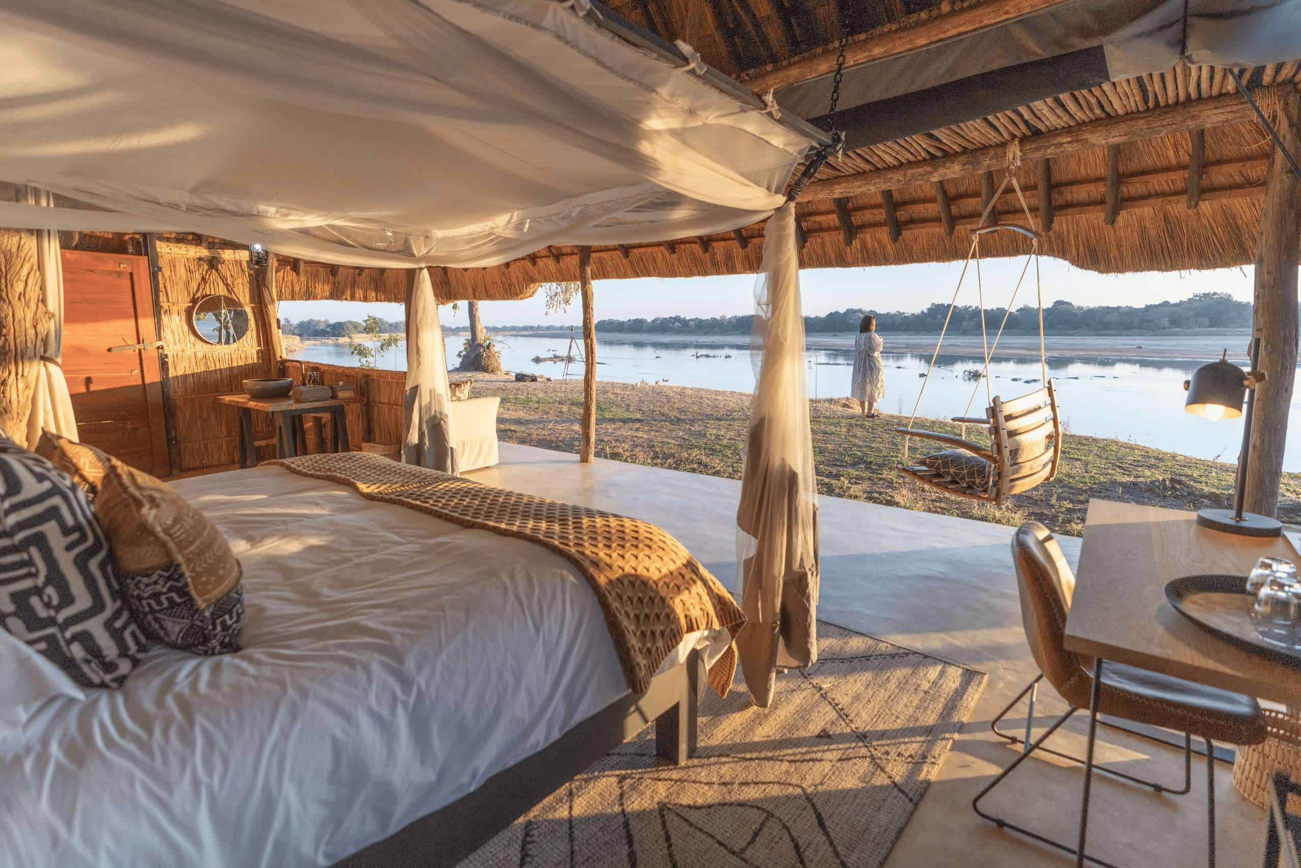 Find the epitome of wild luxury at Time + Tide Chinzombo, Zambia’s premier safari camp. Named after a nearby tree, the award-winning design blends modern style with traditional bush camp elements, featuring canvas, timber, and reed accents. Relax on the shaded verandah or indulge in an in-room spa treatment. The main lodge offers a riverfront sun deck, open-air library, and dinner under the stars.
