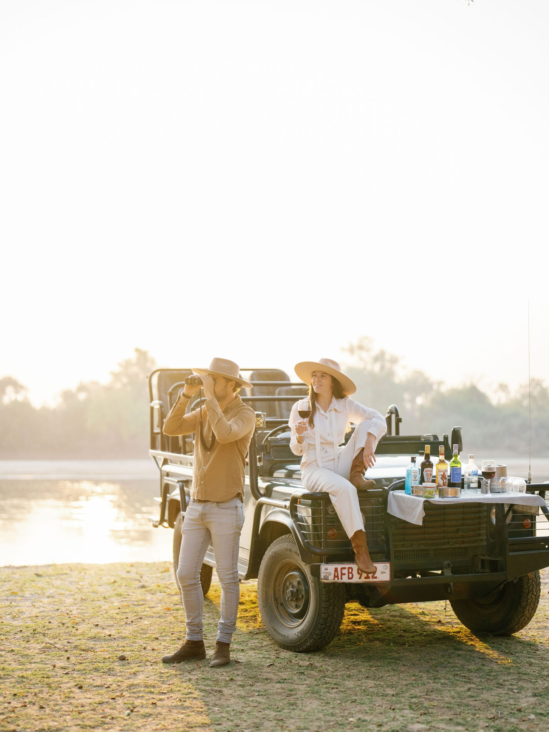 A couple walking towards the remote sundowner bar setup on the banks of the river with Time + Tide in Zambia